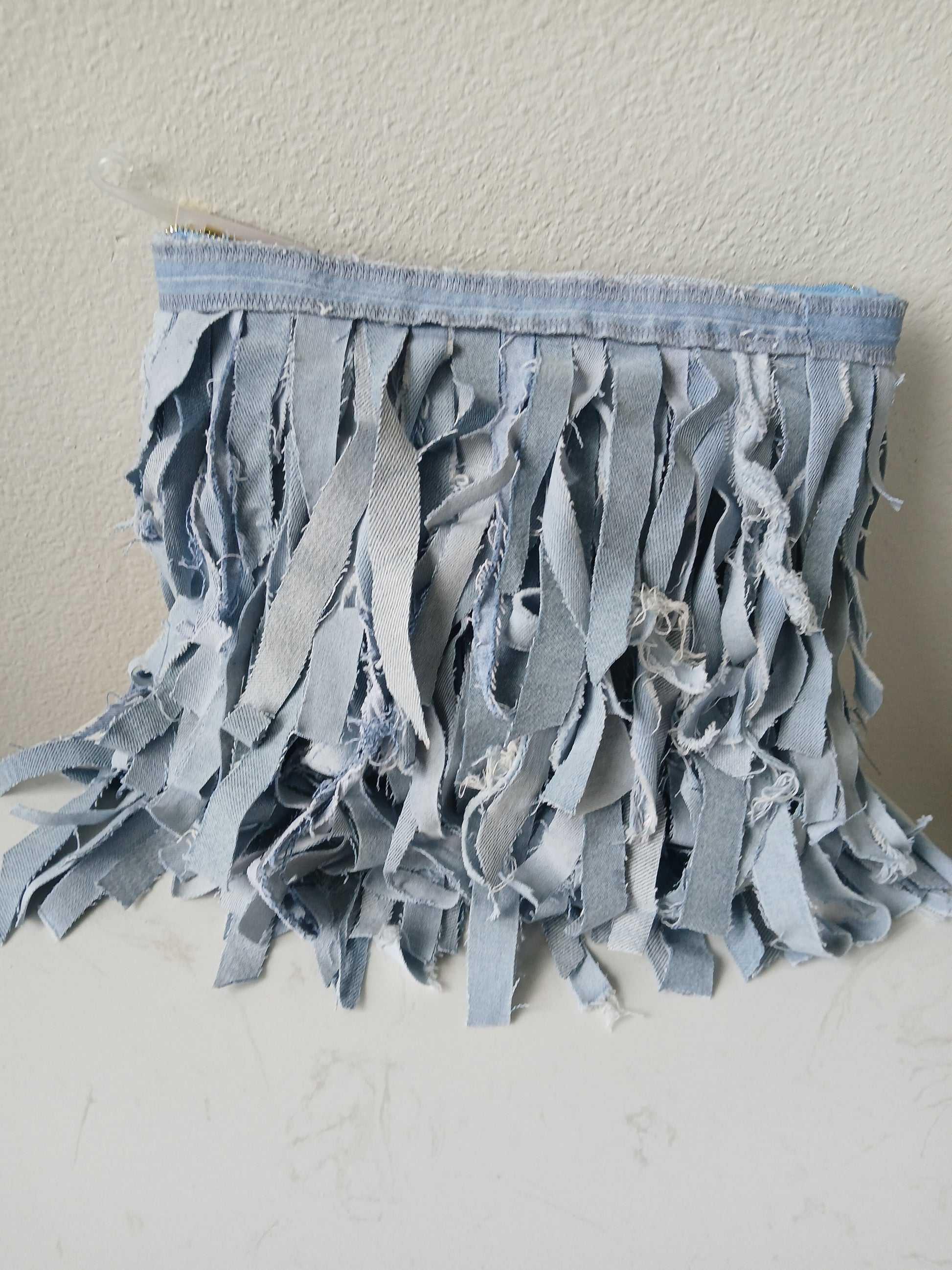 Light Colored Denim Distressed Fringe Zipper Clutch Purse with lining 11.5 x8in