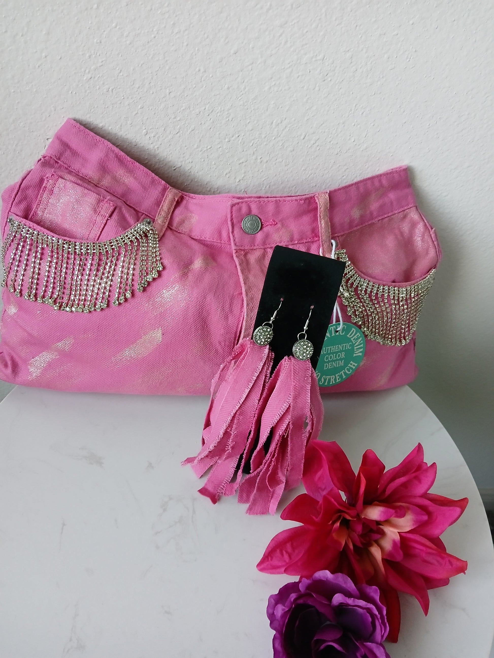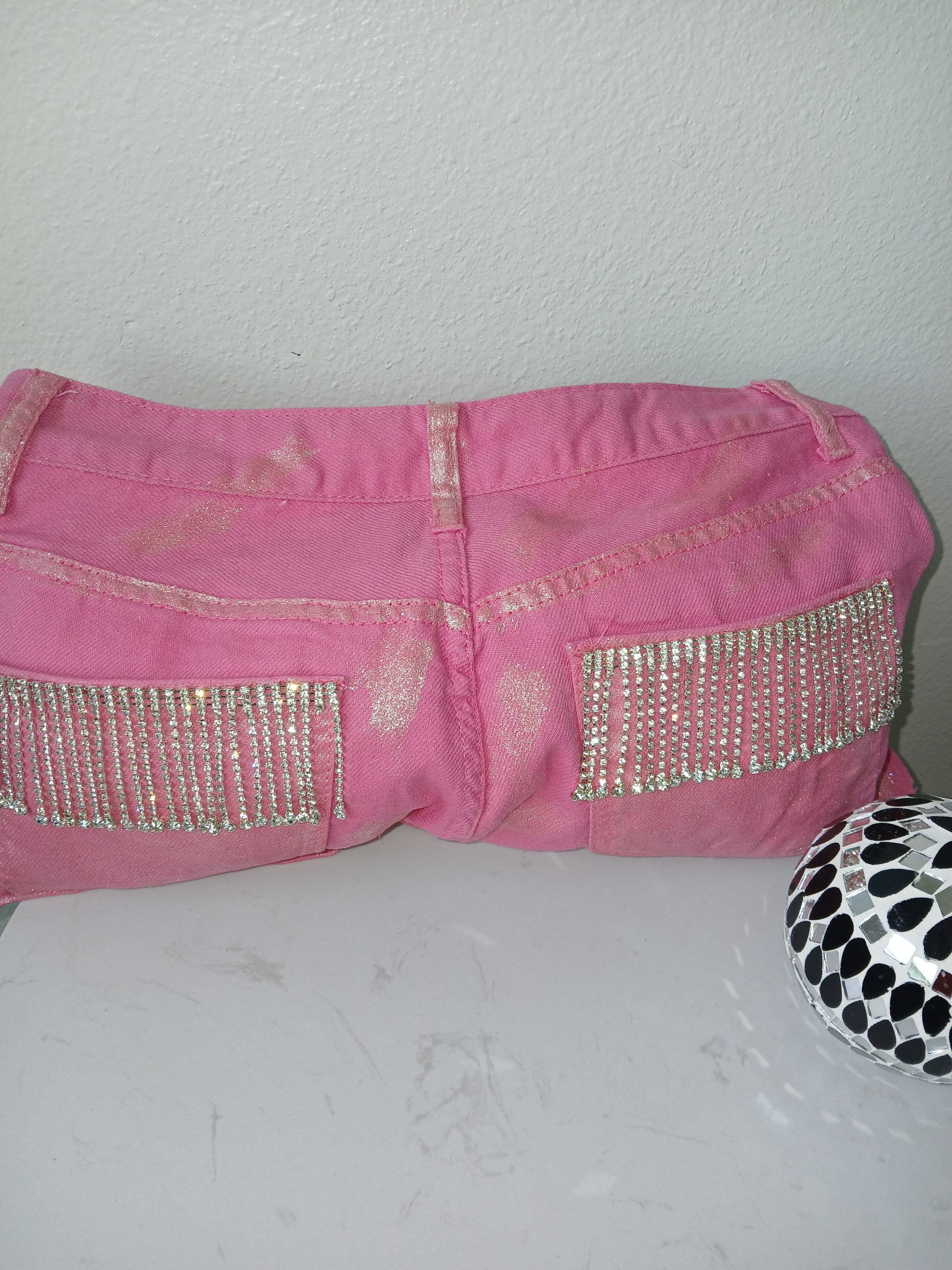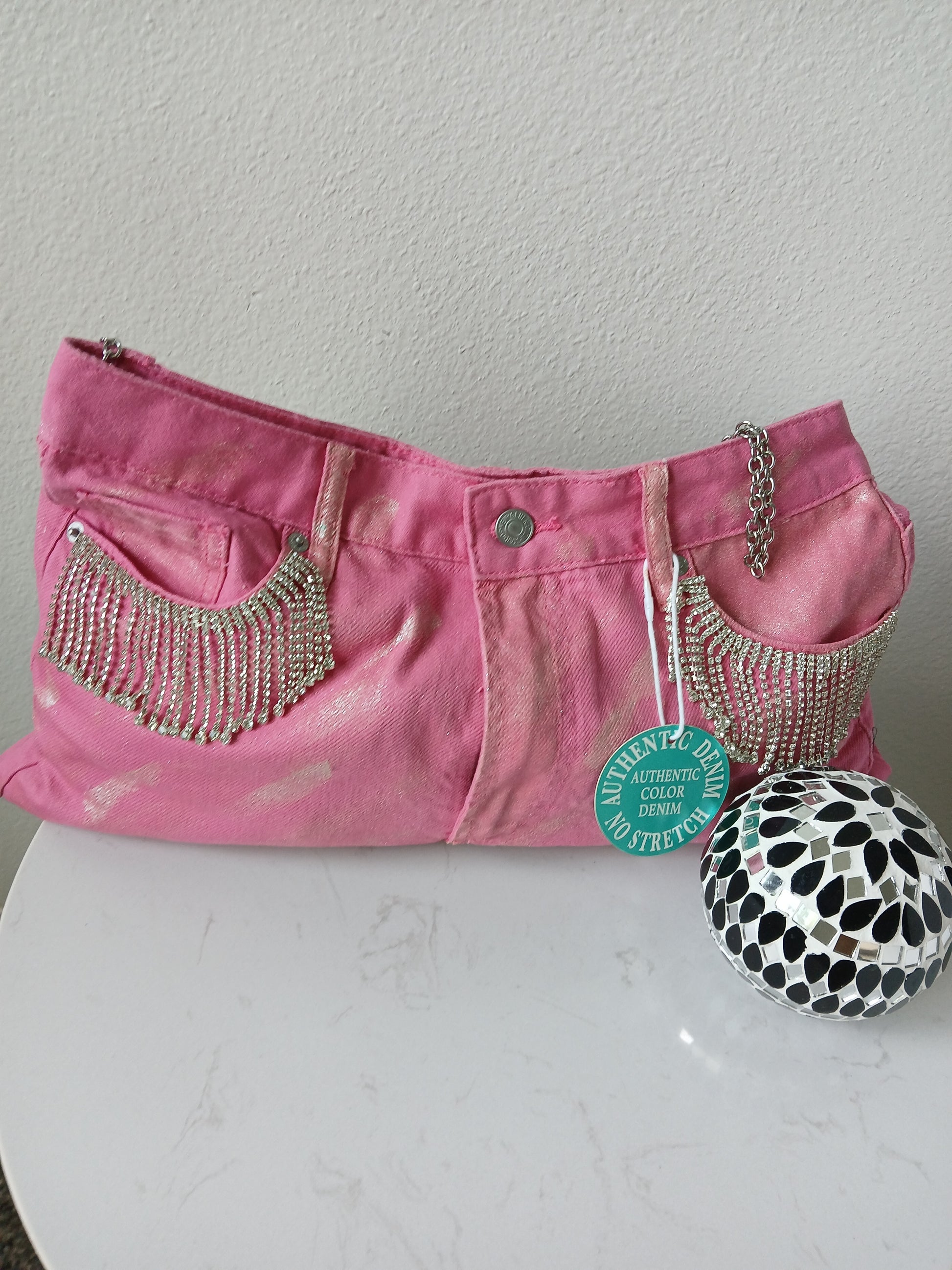 Pink glazed Denim Rhinestone detachable Chain Link Purse