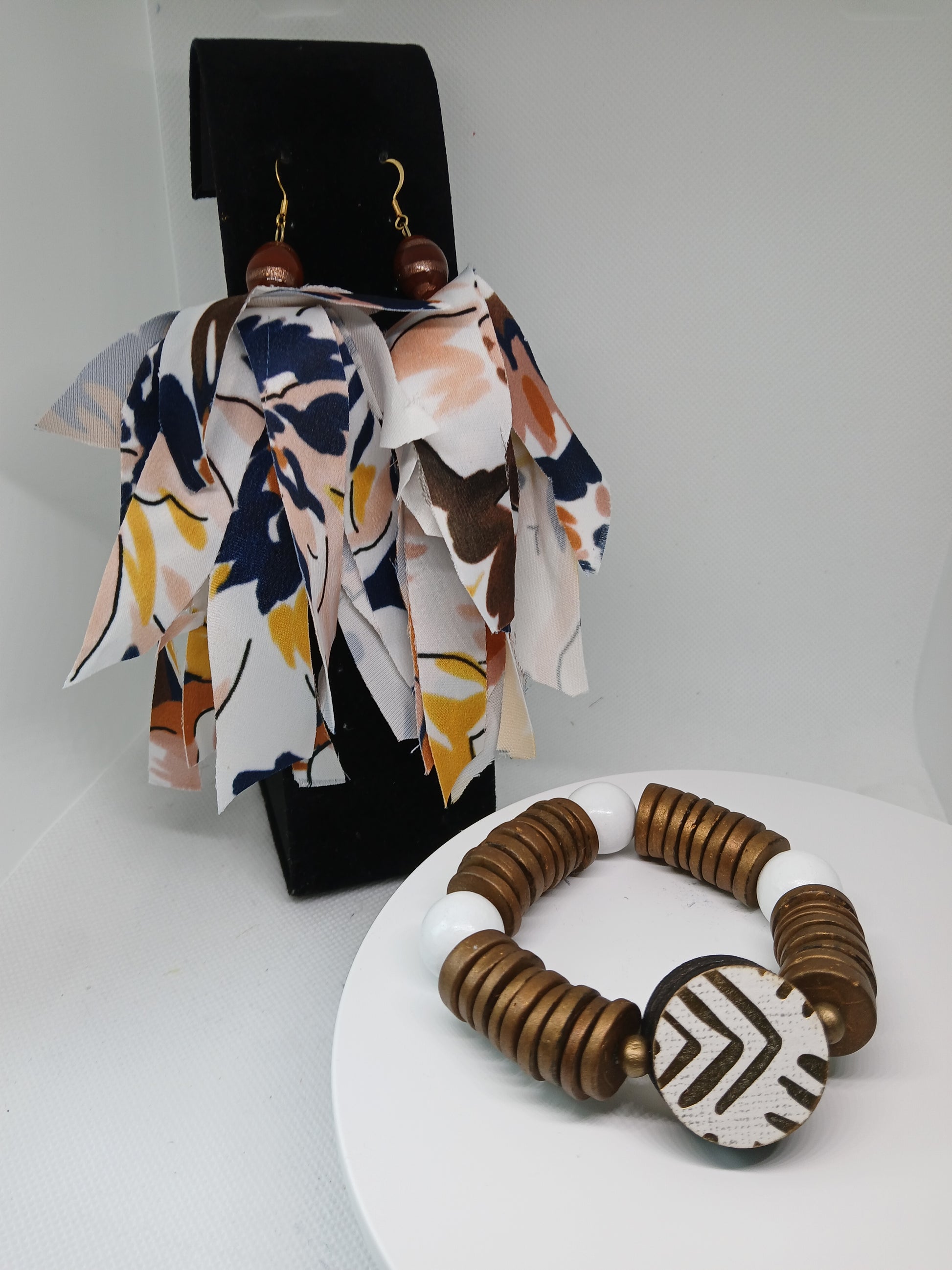 Lightweight Earring and Bracelet Set in a Colorful Fabric, Beads, Paper and Wood 3in long